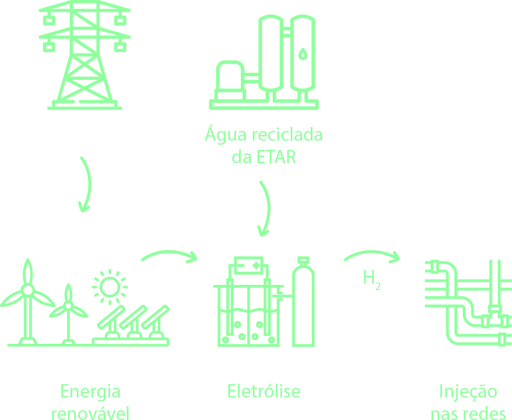 A produção de hidrogénio verde por eletrólise ocorre através da decomposição da água em hidrogénio e oxigénio, utilizando eletricidade proveniente de fontes renováveis, como a energia solar ou eólica. Neste processo, um eletrolisador aplica uma corrente elétrica à água, separando as suas moléculas sem gerar emissões diretas de carbono, ao contrário dos métodos tradicionais baseados em combustíveis fósseis. O hidrogénio produzido será posteriormente injetado nas redes de gás.