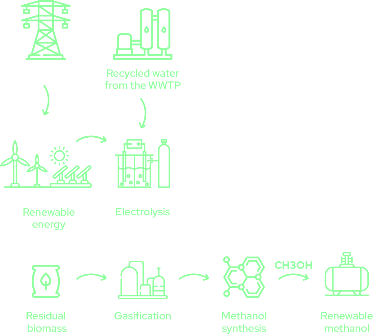 The process of renewable methanol production involves the use of sustainable carbon sources, such as carbon dioxide (CO₂) captured from the atmosphere, combined with green hydrogen produced from renewable electricity. This fossil-free methanol can be used as a clean fuel for industries and transportation, contributing to the reduction of greenhouse gas emissions and promoting a circular and sustainable economy.