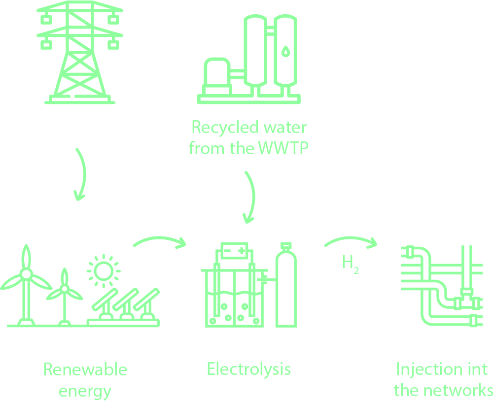Green hydrogen production by electrolysis occurs through the decomposition of water into hydrogen and oxygen, using electricity from renewable sources such as solar or wind energy. In this process, an electrolyser applies an electric current to water, separating its molecules without generating direct carbon emissions, unlike traditional fossil fuel-based methods. The hydrogen produced will then be injected into the gas networks.