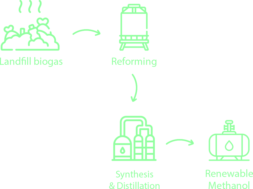 The renewable methanol production process involves the use of renewable gases, such as landfill biogas, promoting a circular and sustainable economy. The methanol produced can be used as a clean fuel for industry and transport, contributing to the reduction of greenhouse gas emissions.